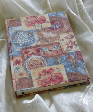 The book is sewn by hand with sewn in spacing strips that make it possible to stick in cards and any farely flat item. Portrait format of approx. 18x25 cm.