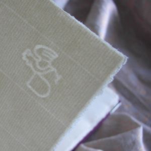 The book block has been sewn by hand from off-white watermarked Ingres-paper with deckle edges. Each book comes with 144 pages.