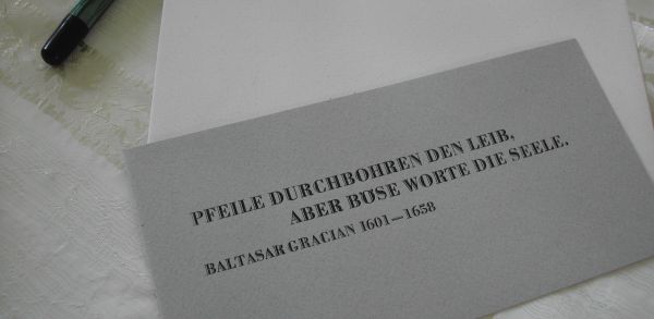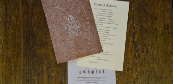 The song of the fate of the tamed cockroach (in German). Set from Trajanus and printed on a handmoved press on deckle-edge paper, limited edtion with blind embossing - enclosed within the card with a linocut by Annette C. Diálin printed from the block on grey paper in two shades of brown. Size of card 15x23cm, with envelope. Euro 16.-