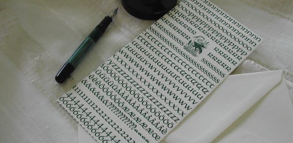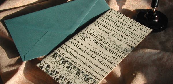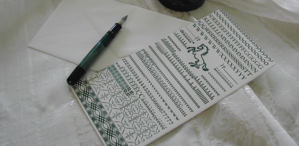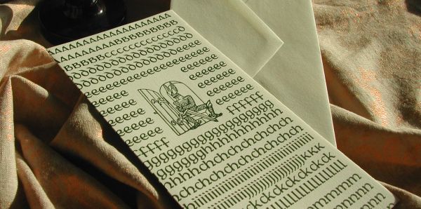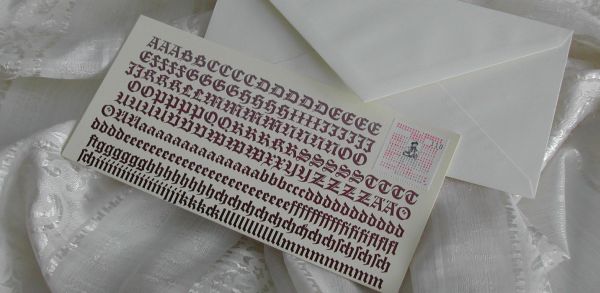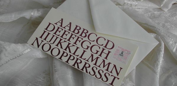 Front and back of card with alphabet/metal type Figaro. DIN-long (approx. 21x11cm), 4 pages, with envelope.