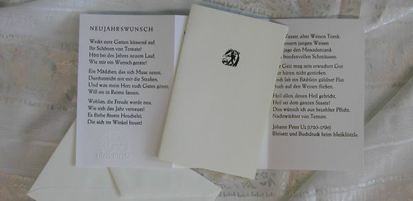 The 6-pages card comes with a separate sheet on which a New Year's poem has been printed (hand set from Trajanus in German). It is an 18th century poem by Johann Peter Utz. With envelope size 12x18 cm.