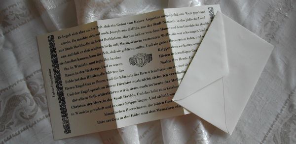 The text is taken from the story on the birth of Christ how evangelist Luke has told it (set from Bodoni in German). 6-pages card. With envelope size 12x18 cm.