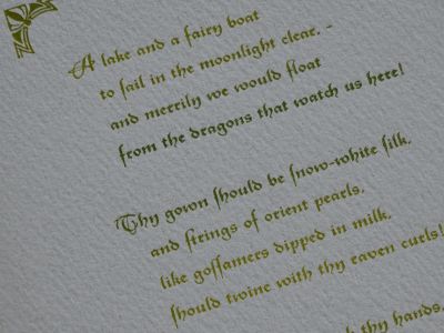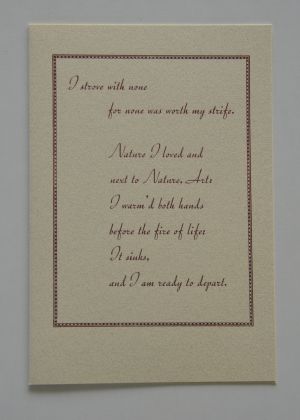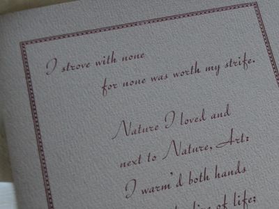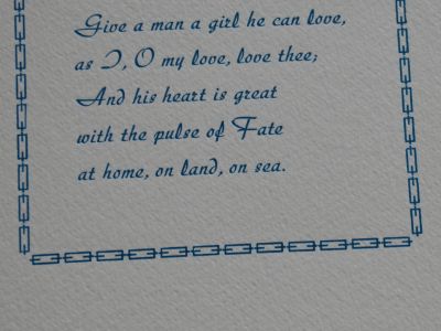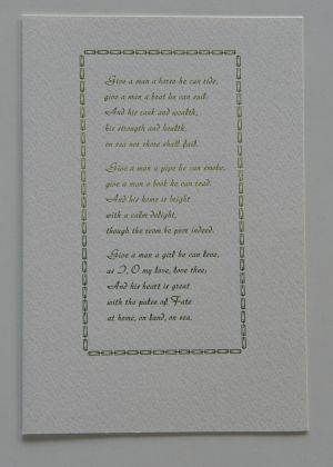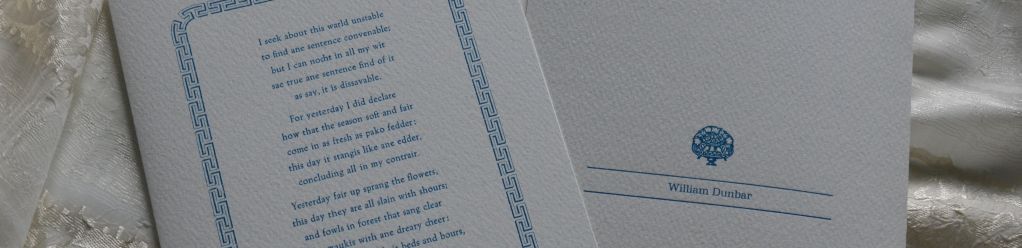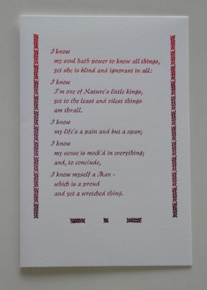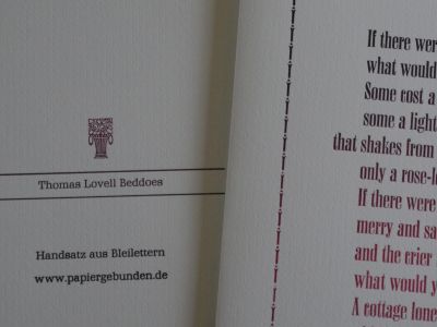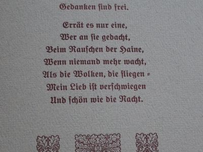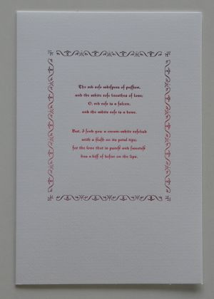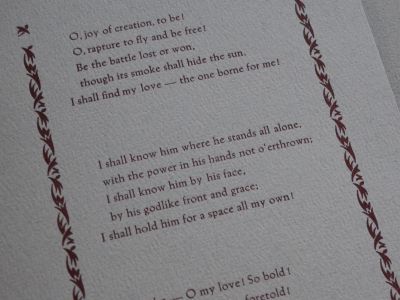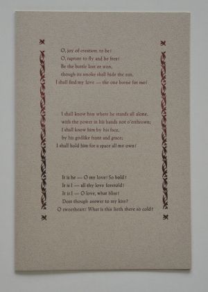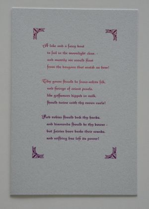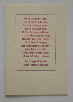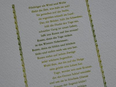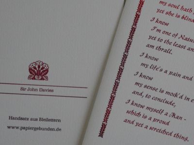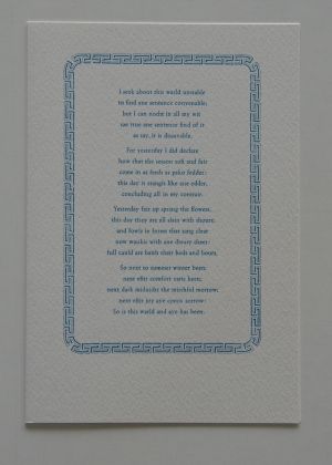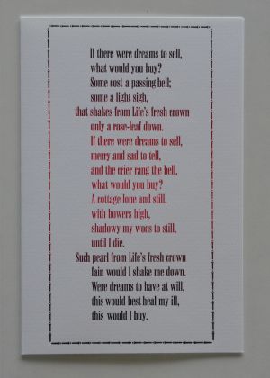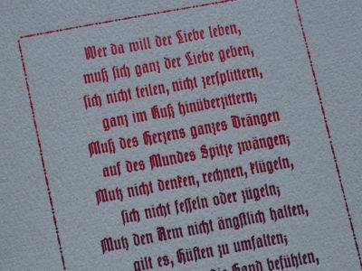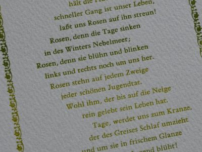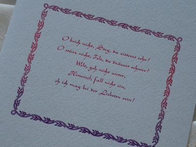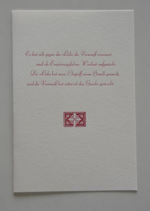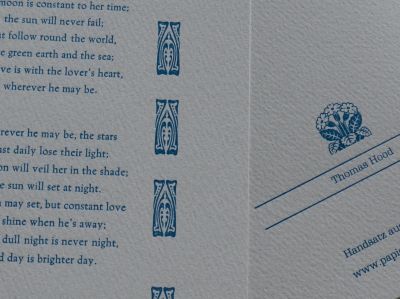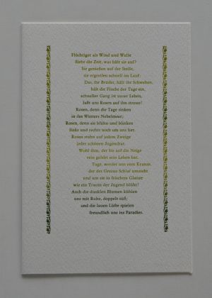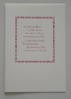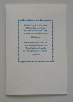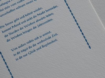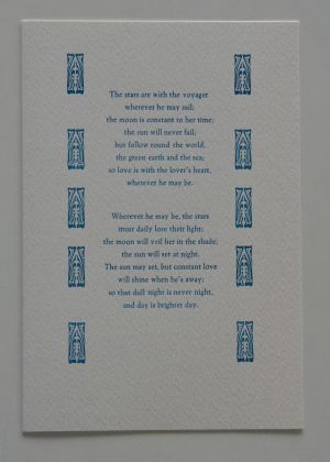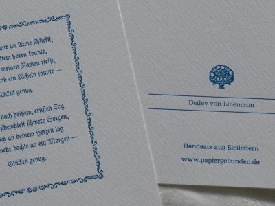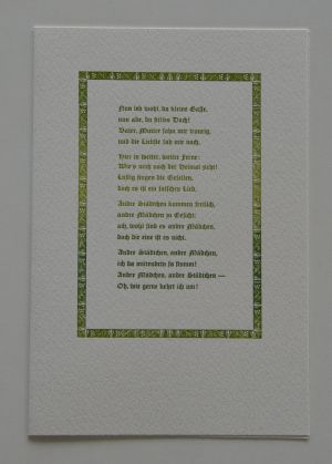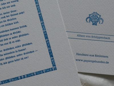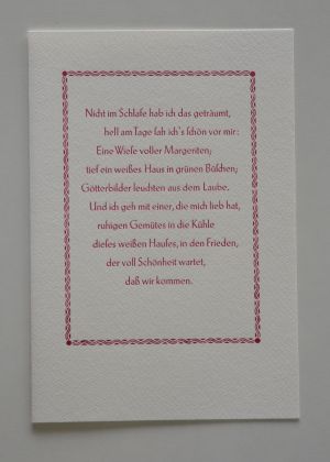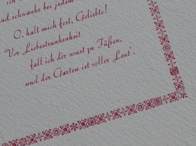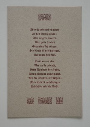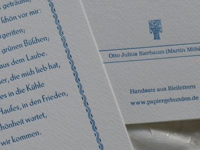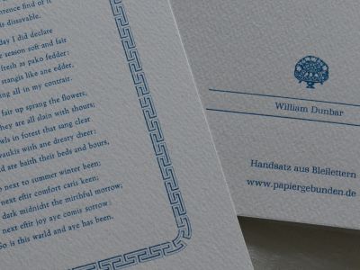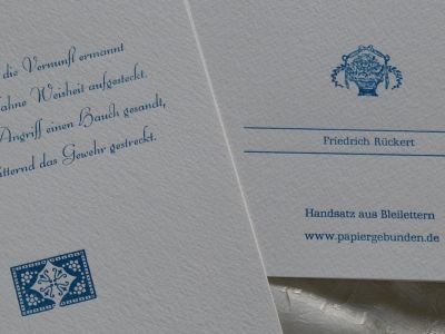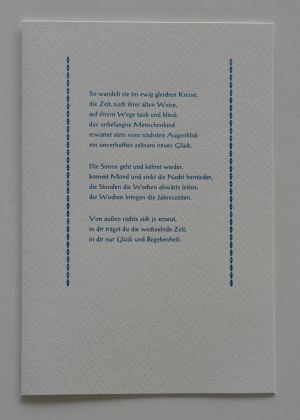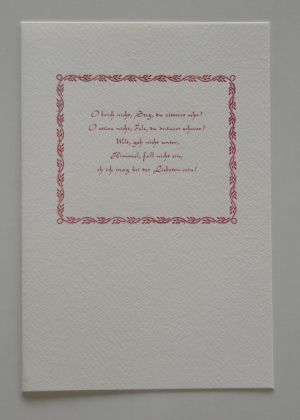 Texts are hand set from metal type and typography and design resemble a framed picture using old letterpress ornaments. Some cards will be printed multicolour, all are printed on a handdriven proofing press.