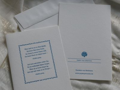 Papers choosen are strong, structured and always with a natural surface. Each card comes with an envelope. The card's size ist 15x22 cm. Every card is a limited edition