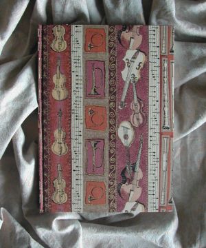 The book is sewn by hand with sewn in spacing strips that make it possible to stick in cards and any farely flat item. Portrait format of approx. 18x25 cm.