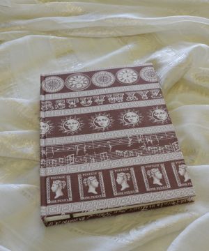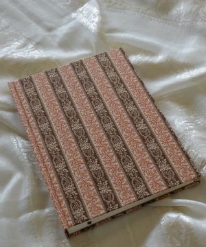 144 pages from paper Sympathicus (yellowish and rough) 18 spacing strips Endpaper brick red Ribbon page marker grey