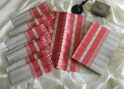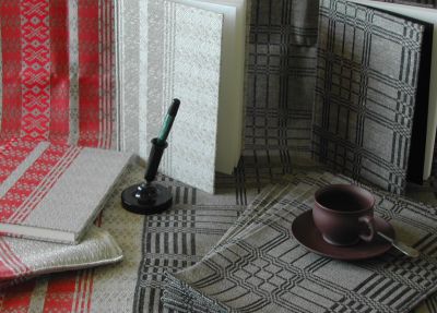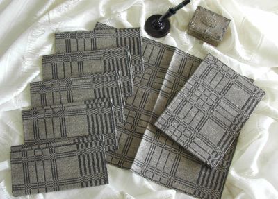This is a set of 6 place mats and a book, that can be used either for a visitor's book or for noting down recipes. Place mats and book cover have been made from the same linen classically used for towels.